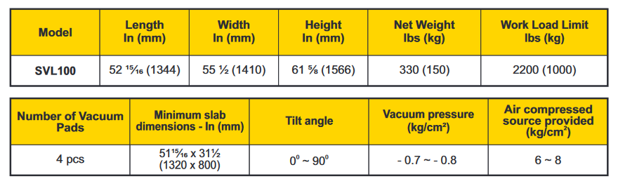 - High Capacity: Safely lifts and moves slabs weighing up to 2,200 lbs (1,000 kg).
