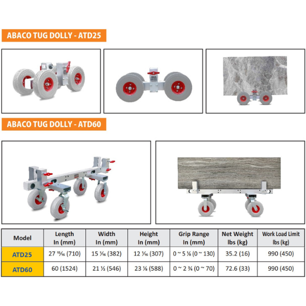 - Four-solid-wheel structure makes the dollies unshockable, easy to handle and efficient in moving material slabs without getting damaged