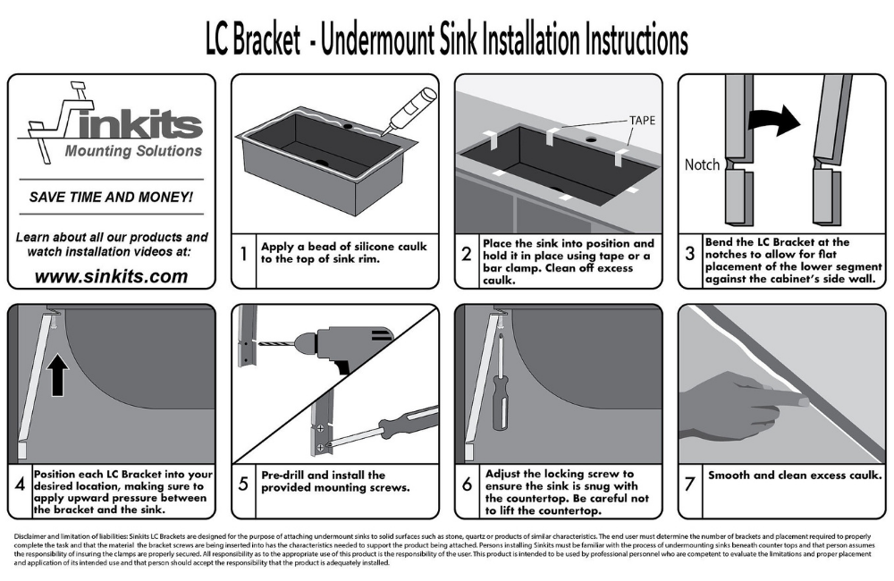 Sinkits LC Bracket (Low Clearance) is the preferred tool for sink repairs and installations where there isn’t enough room between the sink rim and the cabinet to use standard clips or clamps.